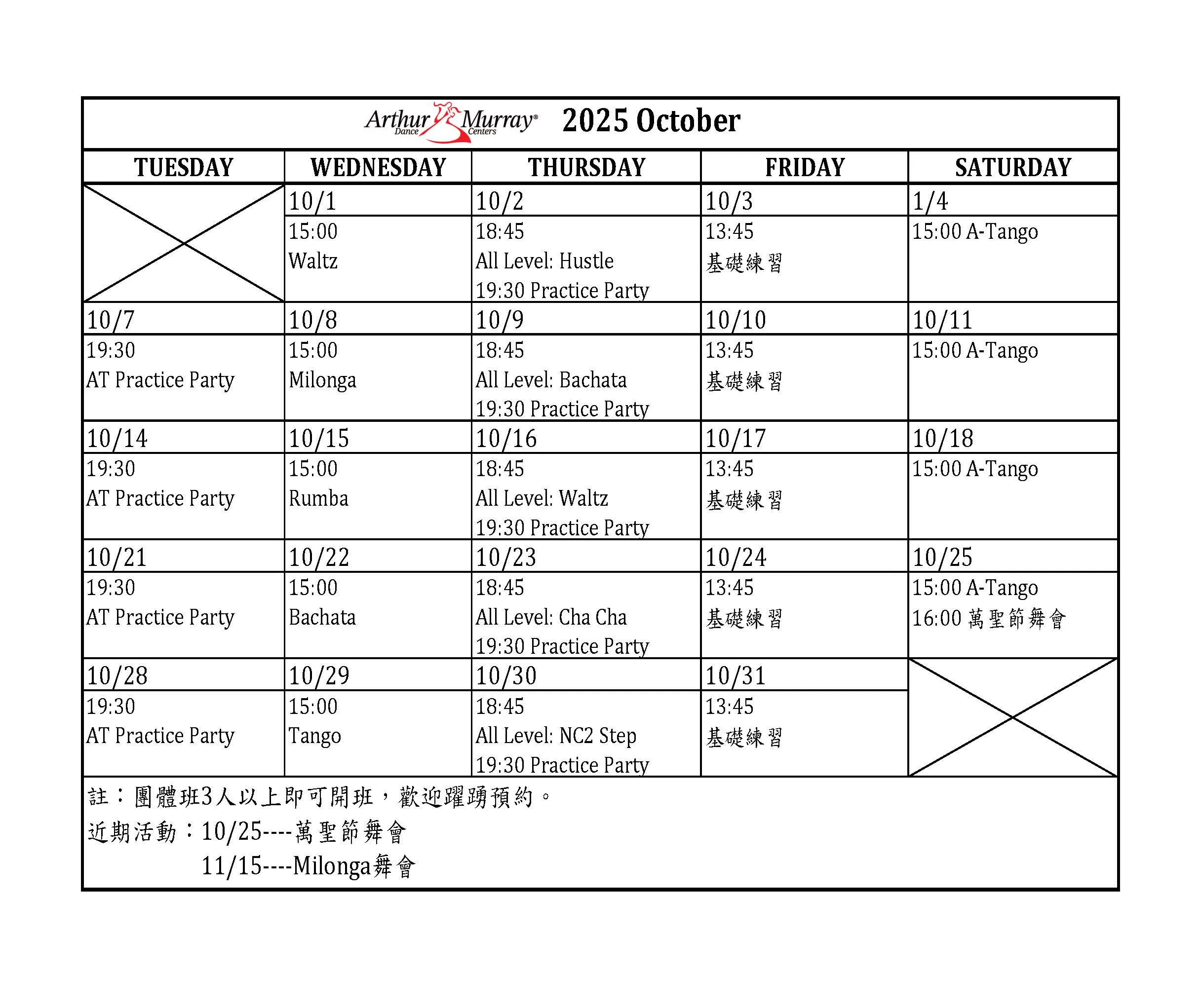 📅 以下是十月份的團班課表,快來選一堂屬於你的舞課吧!
