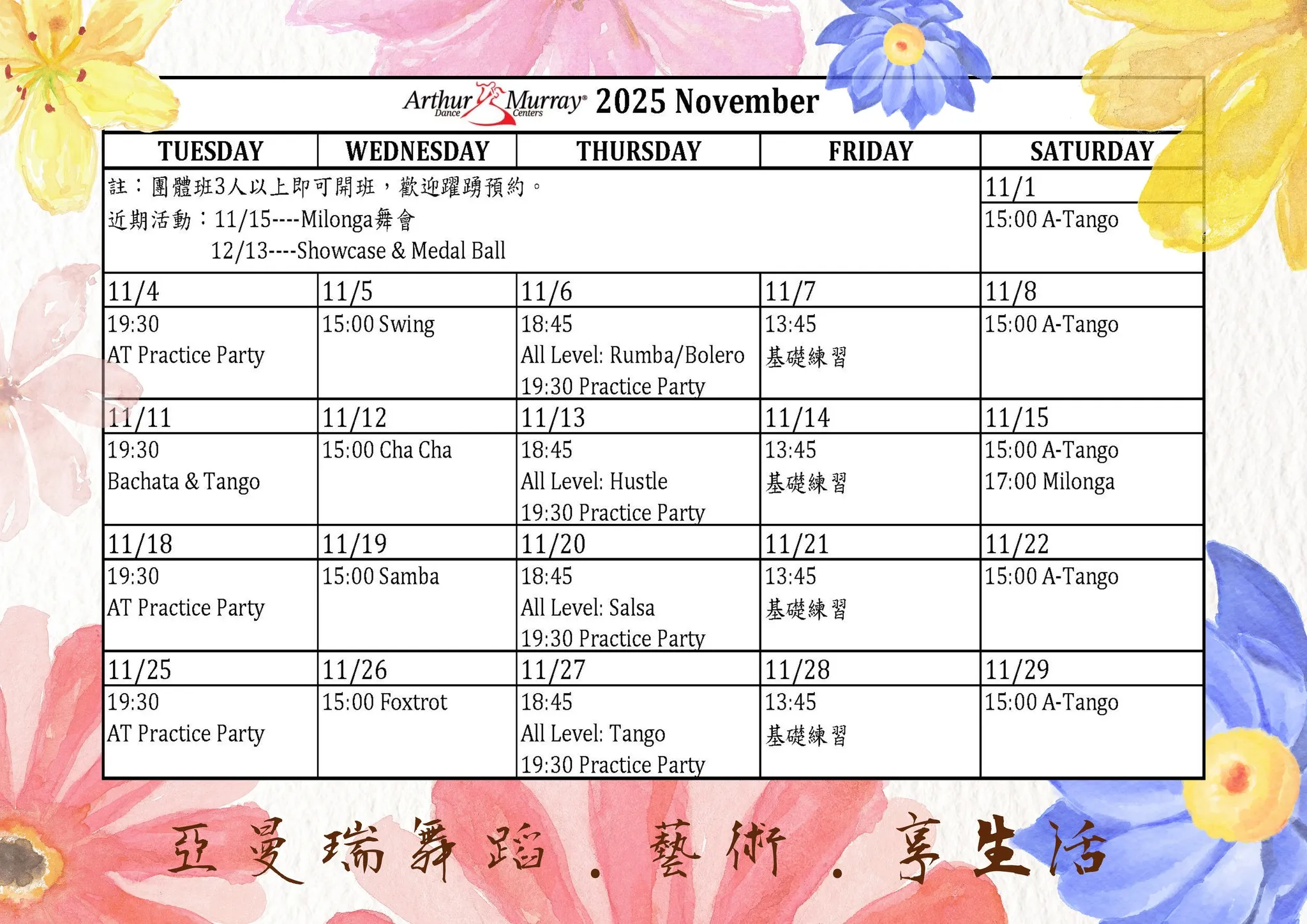 亞曼瑞舞蹈教室十月份團班課程正式開課,課程設計多元,從基礎入門到進階技巧皆有安排,3人以上即可開班,歡迎朋友相約一起報名。
